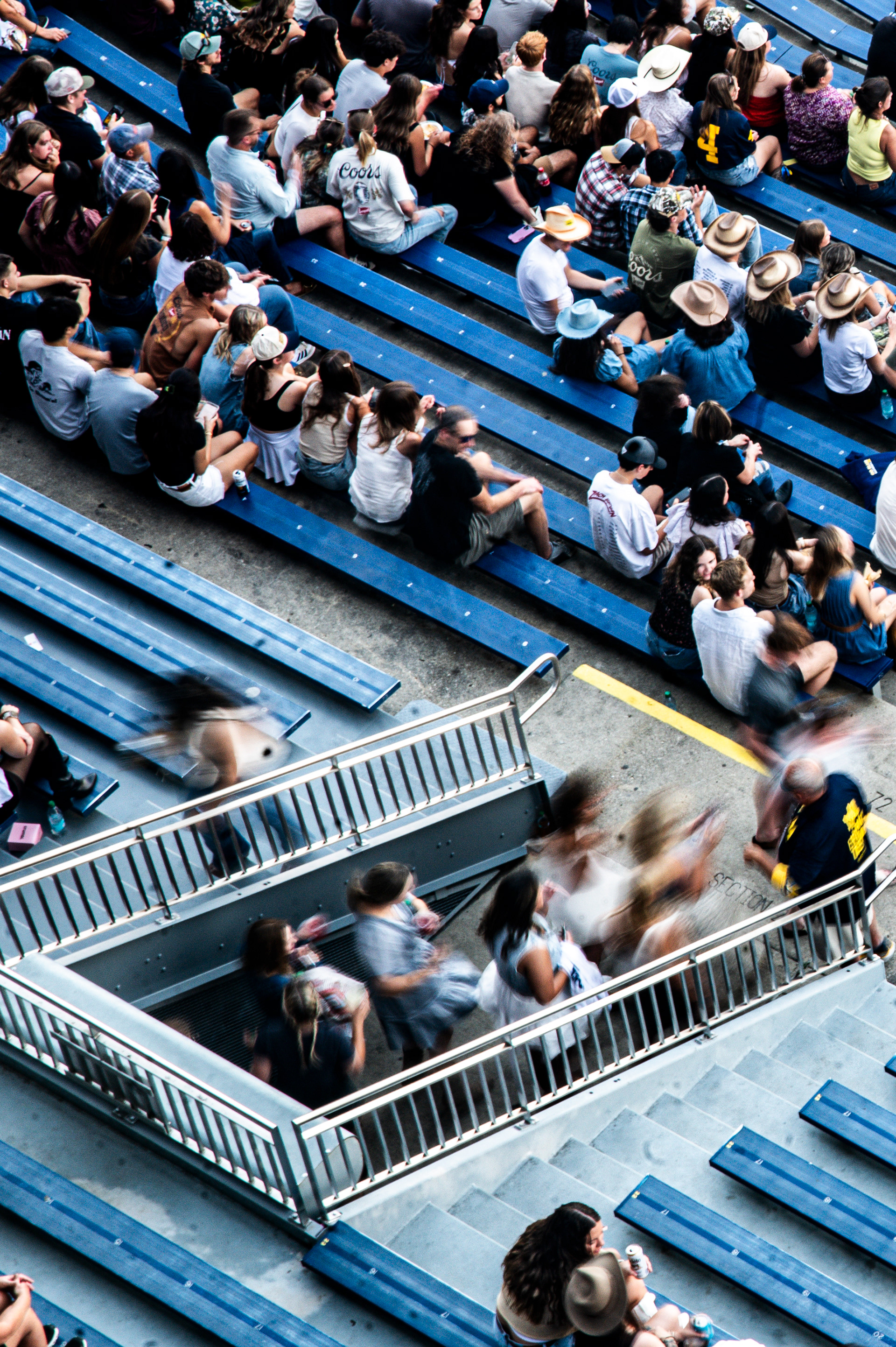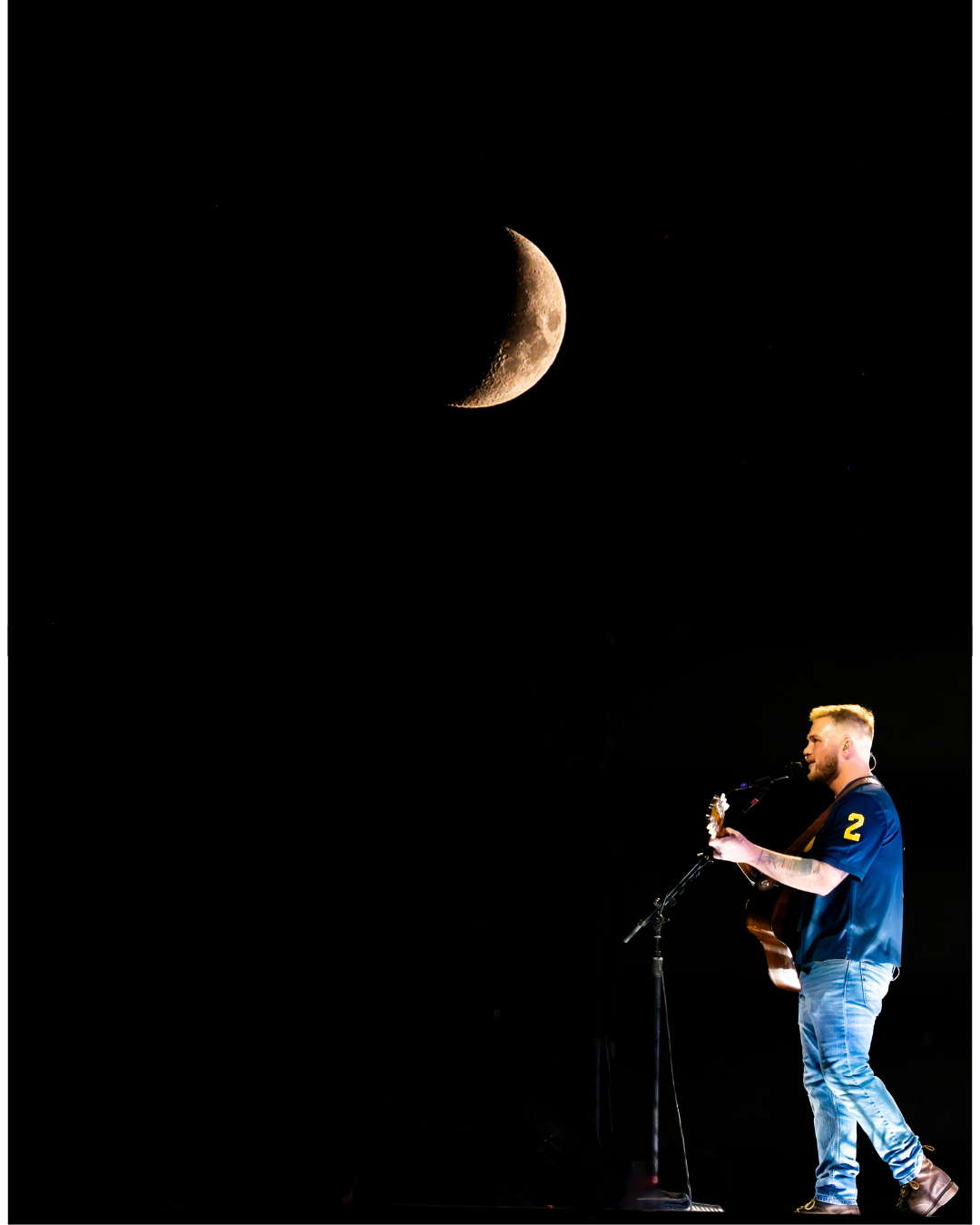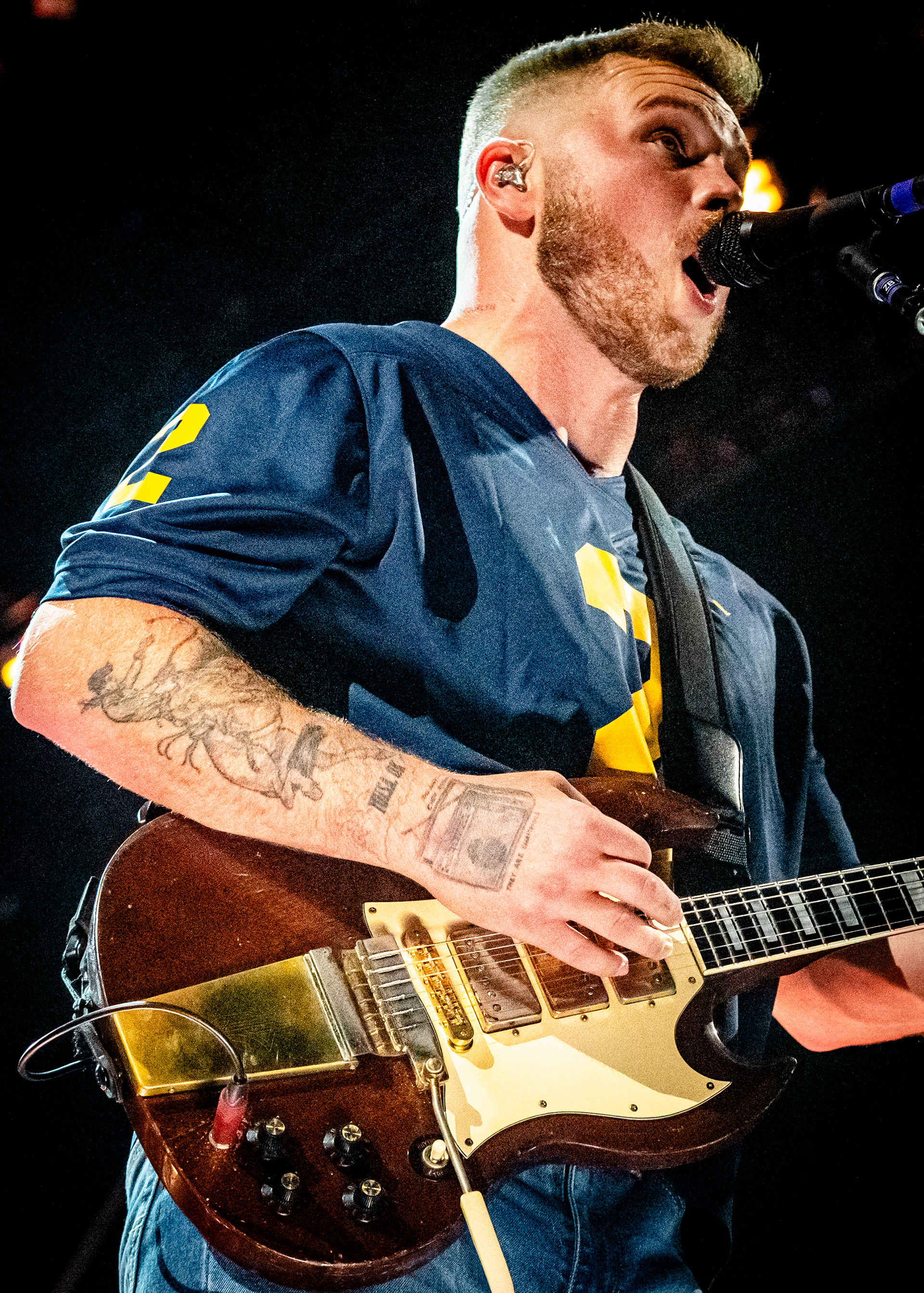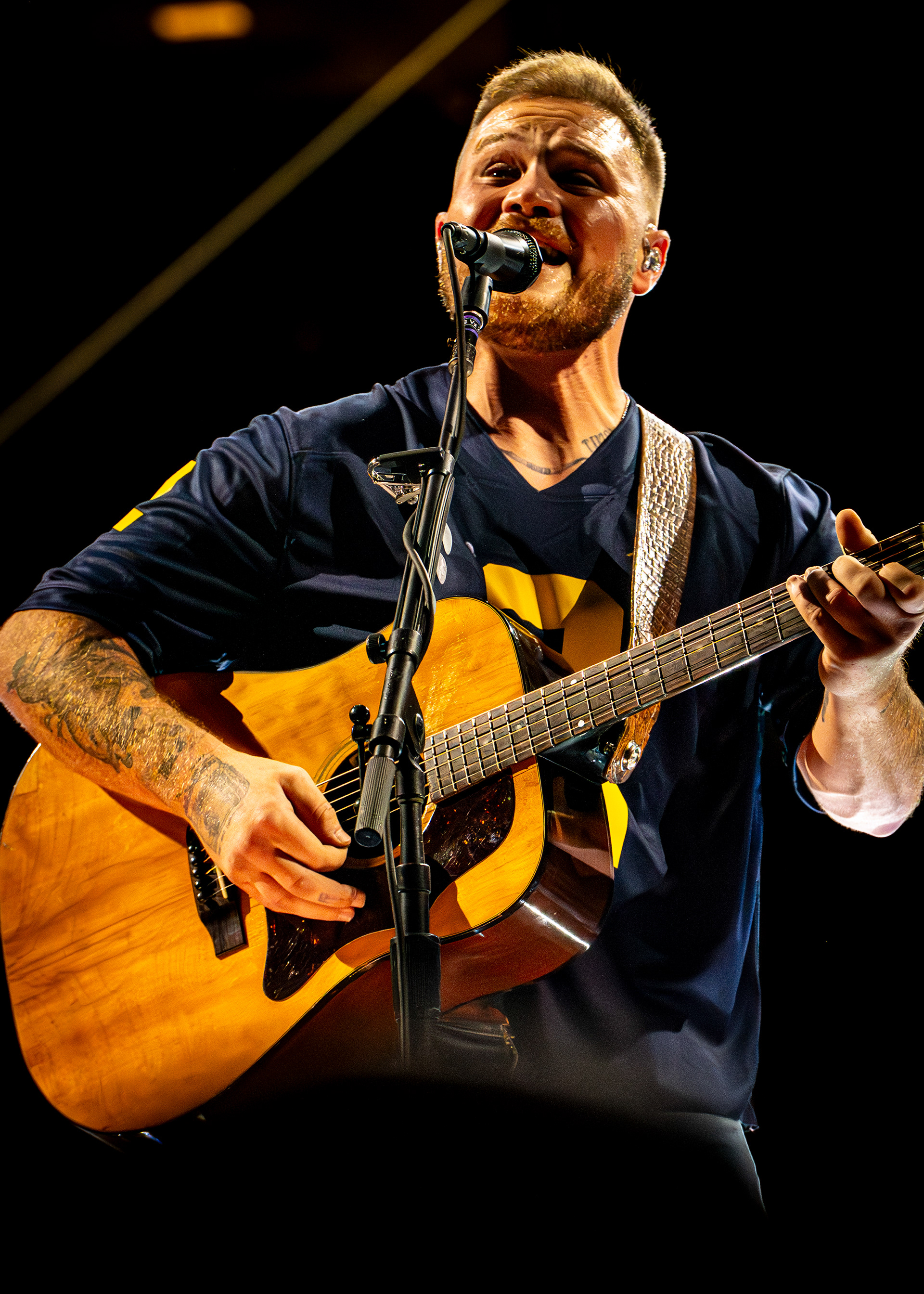 On September 27, 2025, Zach Bryan performed at Michigan Stadium in Ann Arbor before a record-setting crowd of 112,408, marking the largest ticketed concert by a single headliner in the United States. This was also the first major headline performance ever held at the Big House, giving the event both historic and cultural weight. The stage was designed in a circular configuration at midfield, with protective decking covering the turf and elaborate lighting rigs encircling the setup. Bryan was supported by a 16-piece band, and the scale of the production allowed photographers to capture perspectives ranging from sweeping stadium-wide views to intimate close-ups at stage level. The show unfolded with a dramatic shift in atmosphere, beginning with warm natural light and concluding under saturated stadium lighting that cast silhouettes and vivid color. Key moments, such as Bryan wearing a University of Michigan jersey and John Mayer’s appearance, anchored the spectacle. All images documented for The Michigan Daily.