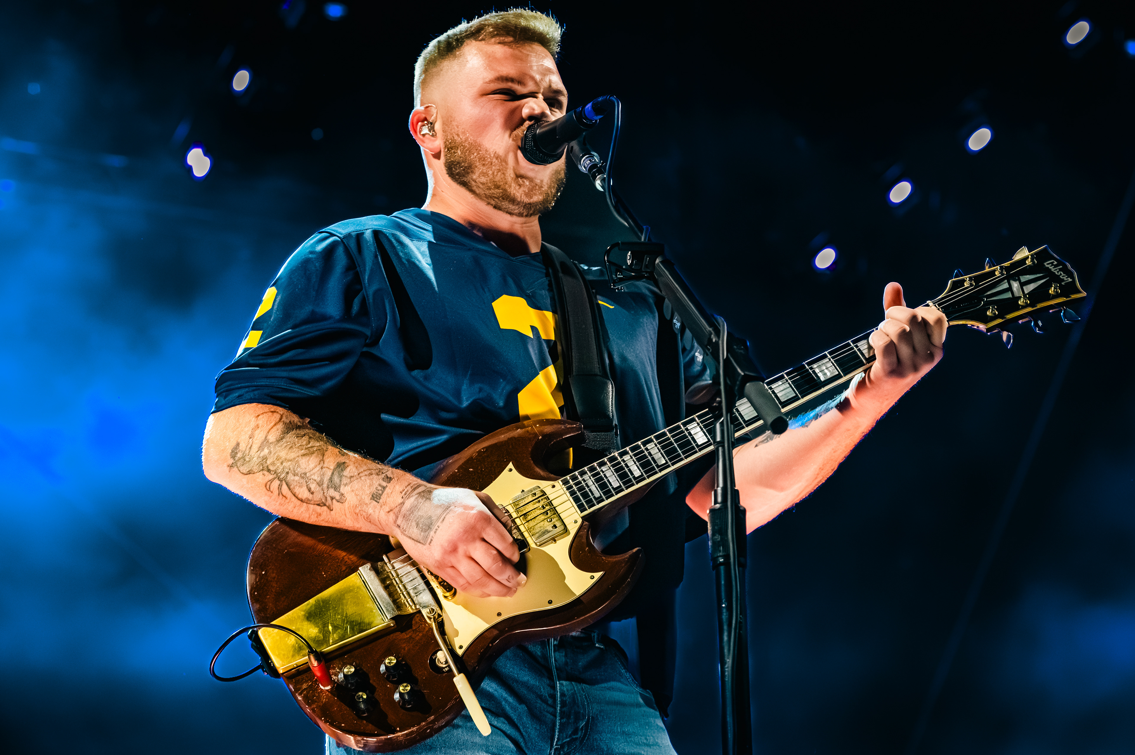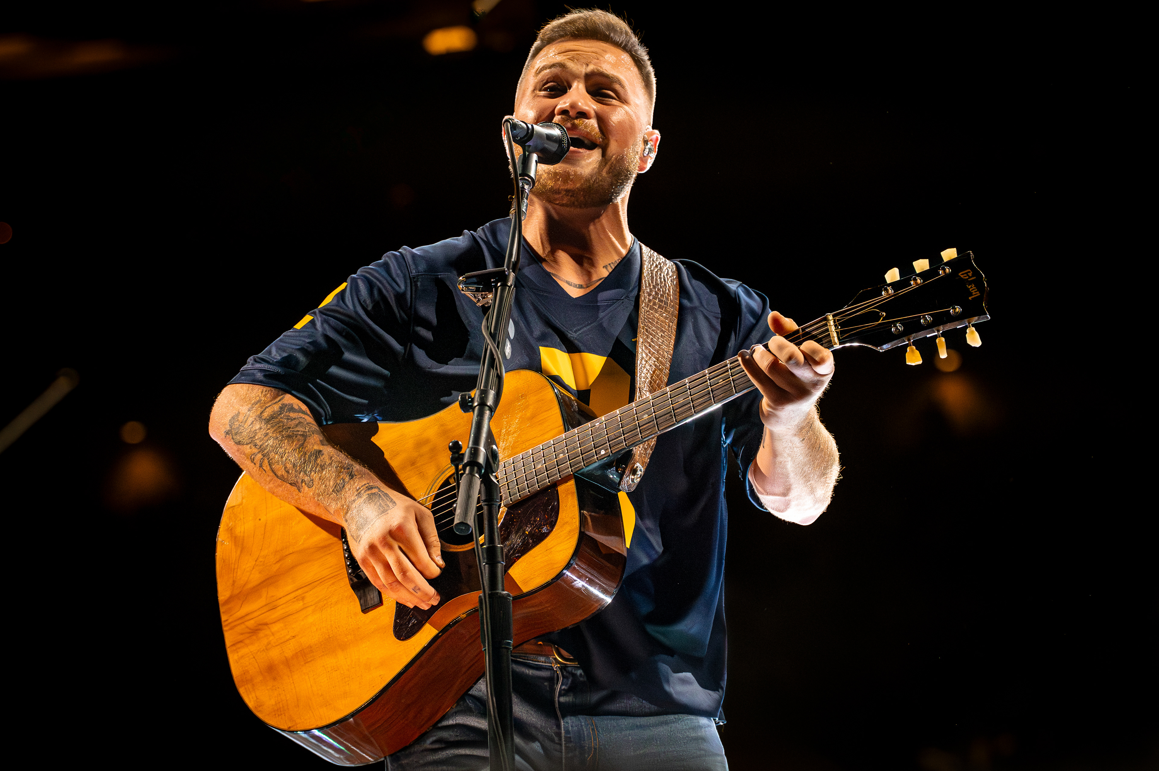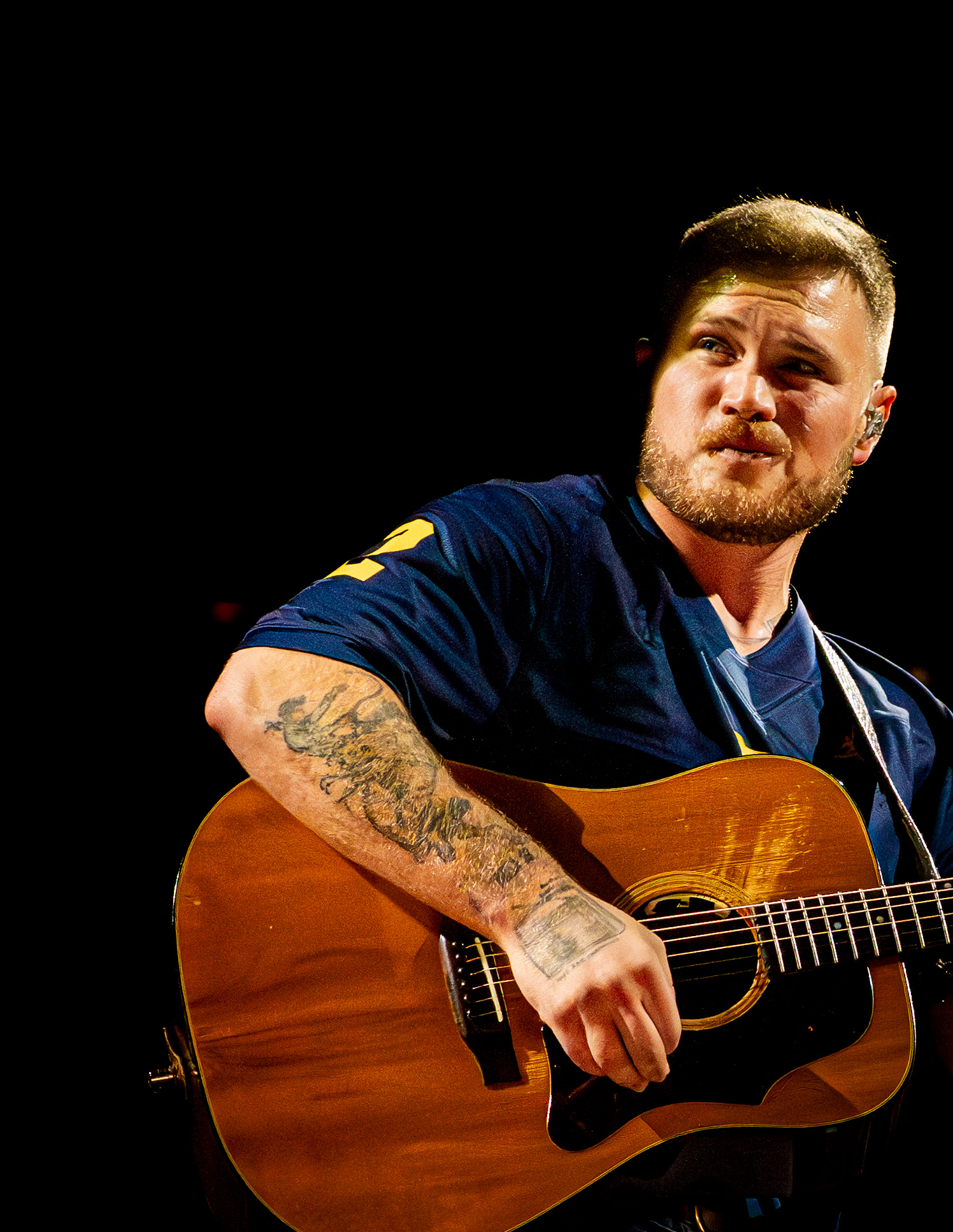 On September 27, 2025, Zach Bryan performed at Michigan Stadium in Ann Arbor before a record-setting crowd of 112,408, marking the largest ticketed concert by a single headliner in the United States. This was also the first major headline performance ever held at the Big House, giving the event both historic and cultural weight. The stage was designed in a circular configuration at midfield, with protective decking covering the turf and elaborate lighting rigs encircling the setup. Bryan was supported by a 16-piece band, and the scale of the production allowed photographers to capture perspectives ranging from sweeping stadium-wide views to intimate close-ups at stage level. The show unfolded with a dramatic shift in atmosphere, beginning with warm natural light and concluding under saturated stadium lighting that cast silhouettes and vivid color. Key moments, such as Bryan wearing a University of Michigan jersey and John Mayer’s appearance, anchored the spectacle. All images documented for The Michigan Daily.